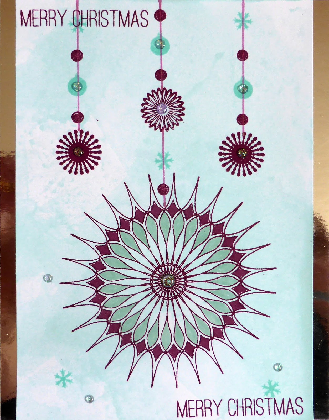 I created the background by applying the ink pad directly to my heat mat and spritzing it with water before using a speedball roller to spread it randomly over the card. I'm quite taken with the subtle cloudy effect this produces. The snowflakes and tiny baubles were stamped in the same colour but look like a deeper shade as the ink has not been diluted.