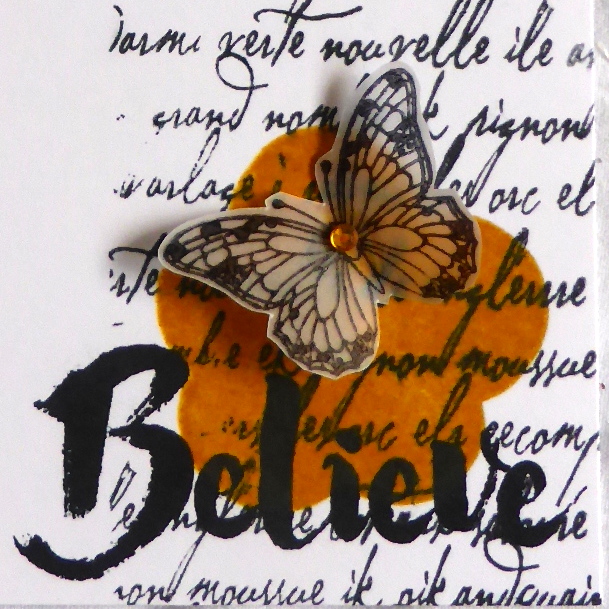 One of my past year's one little words was my sentiment and I used the misti tool to get a good clear deep colour - magic! Finally I stamped and hand cut the butterfly onto vellum and added a gem .