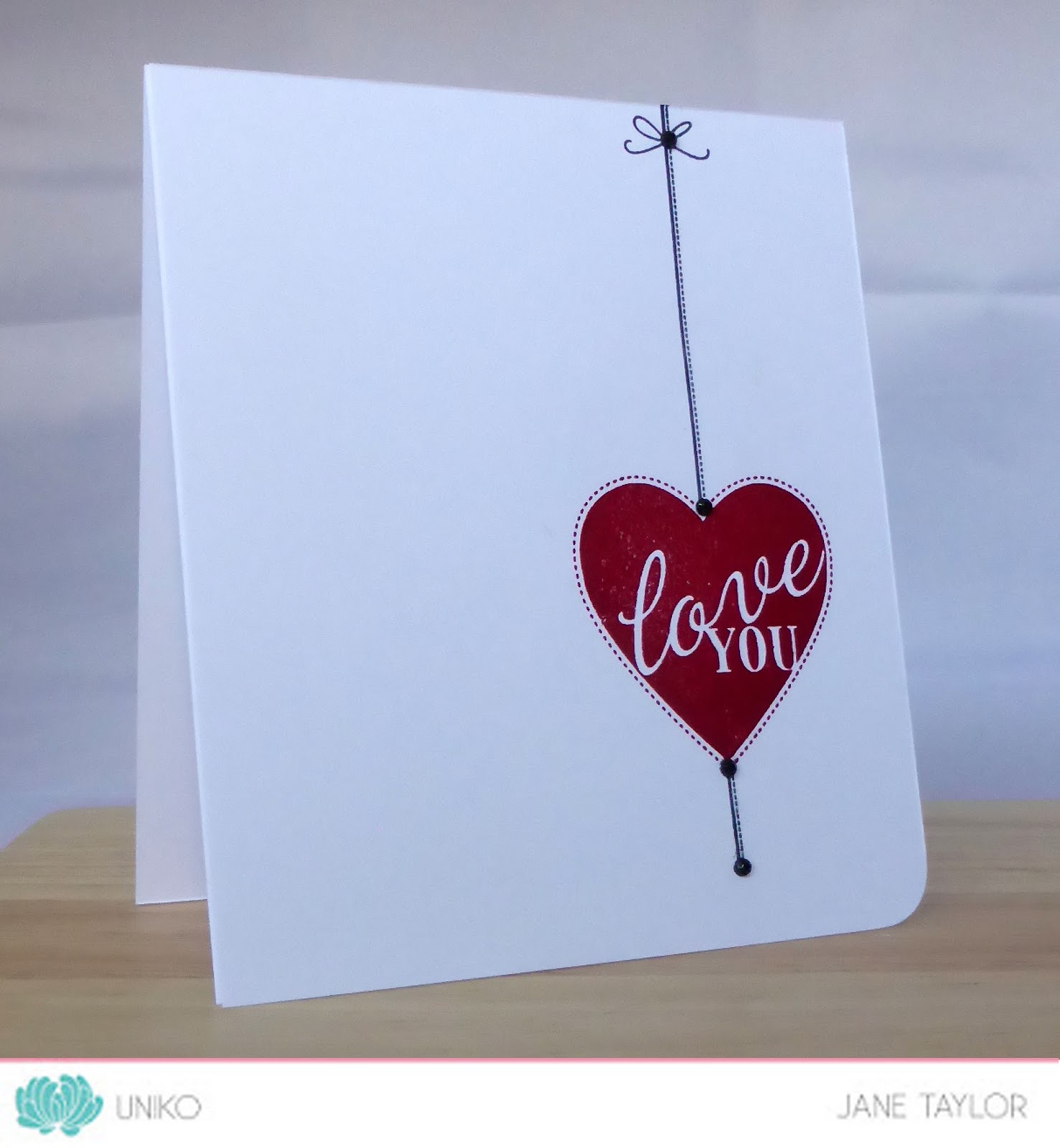 I masked out the heart before stamping the stitched line from Garlands Galore and added a simple bow - also from Garlands Galore - and some black gems to finish off.