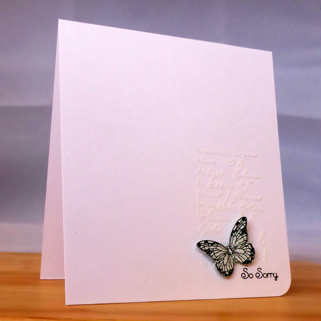 I decided to interpret the distress as a sympathy type of card and added a Uniko sentiment to express this. And the butterfly? Well I just love butterflies and they always seem appropriate whatever the occasion.