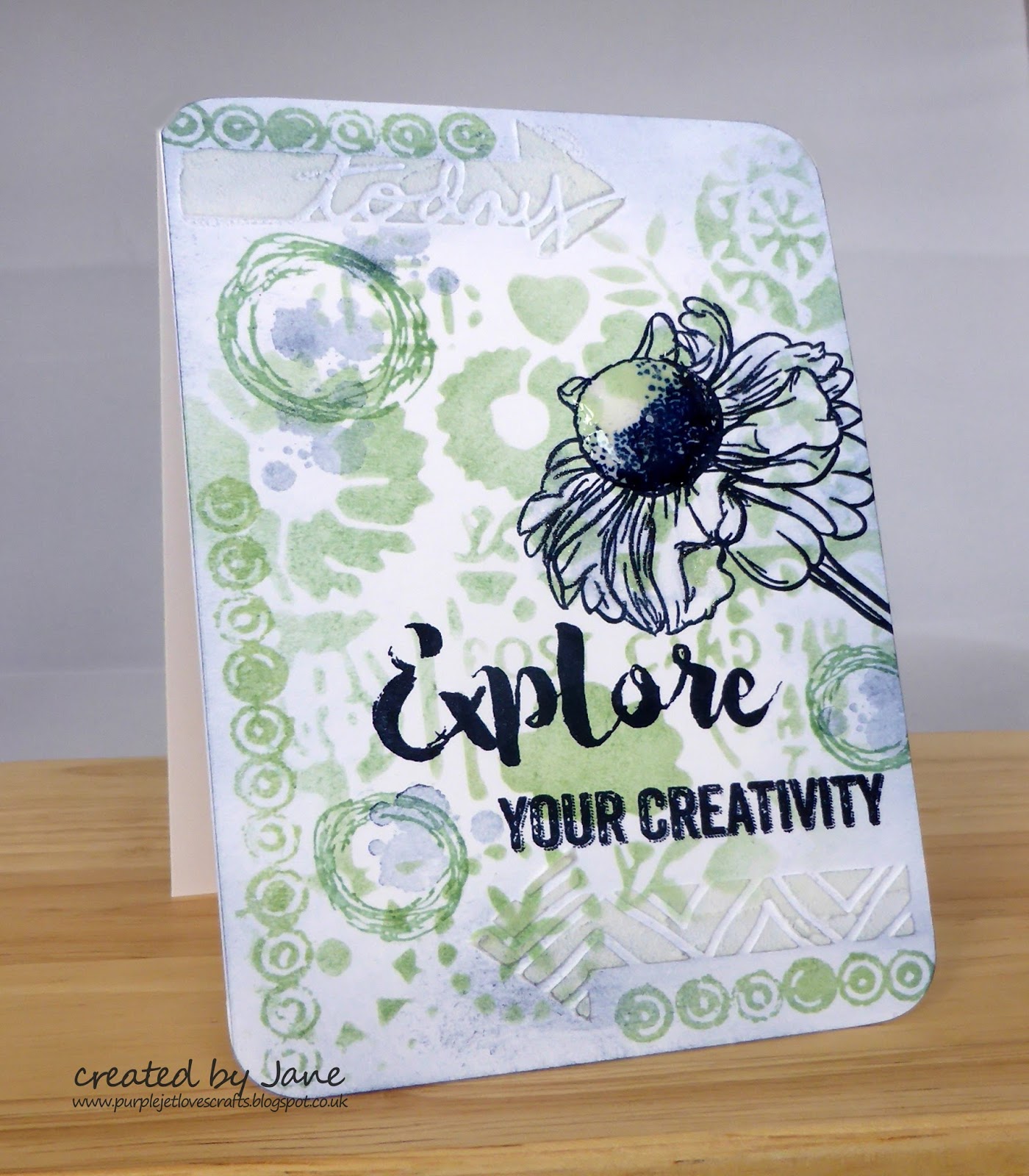 I started by stencilling the background in two minty colours and then used a second stencil to add embossing paste arrows. Next I stamped the inspirational words and the helenium flower in navy - thought the words were very appropriate as that was exactly what I was doing.