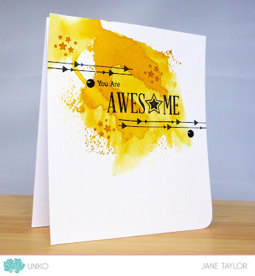I started my card by smooshing some mustardy yellow ink onto watercolour card - how brave is that using a yellow instead of blue? Once this was dry I stamped the black elements and added a trio of same colour as the background star clusters to highlight the main sentiment.