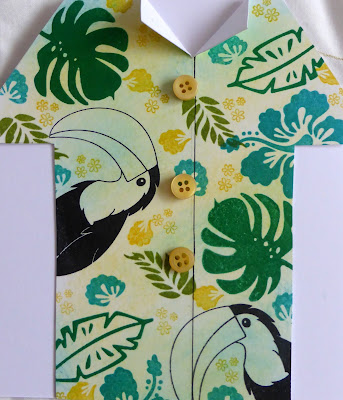 I had this image in my head of those tropical shirts that were, maybe still are, popular to wear on tropical holidays. So I hand cut a shirt shape and then got busy stamping the toucan and leaves in suitable tropical colours.
