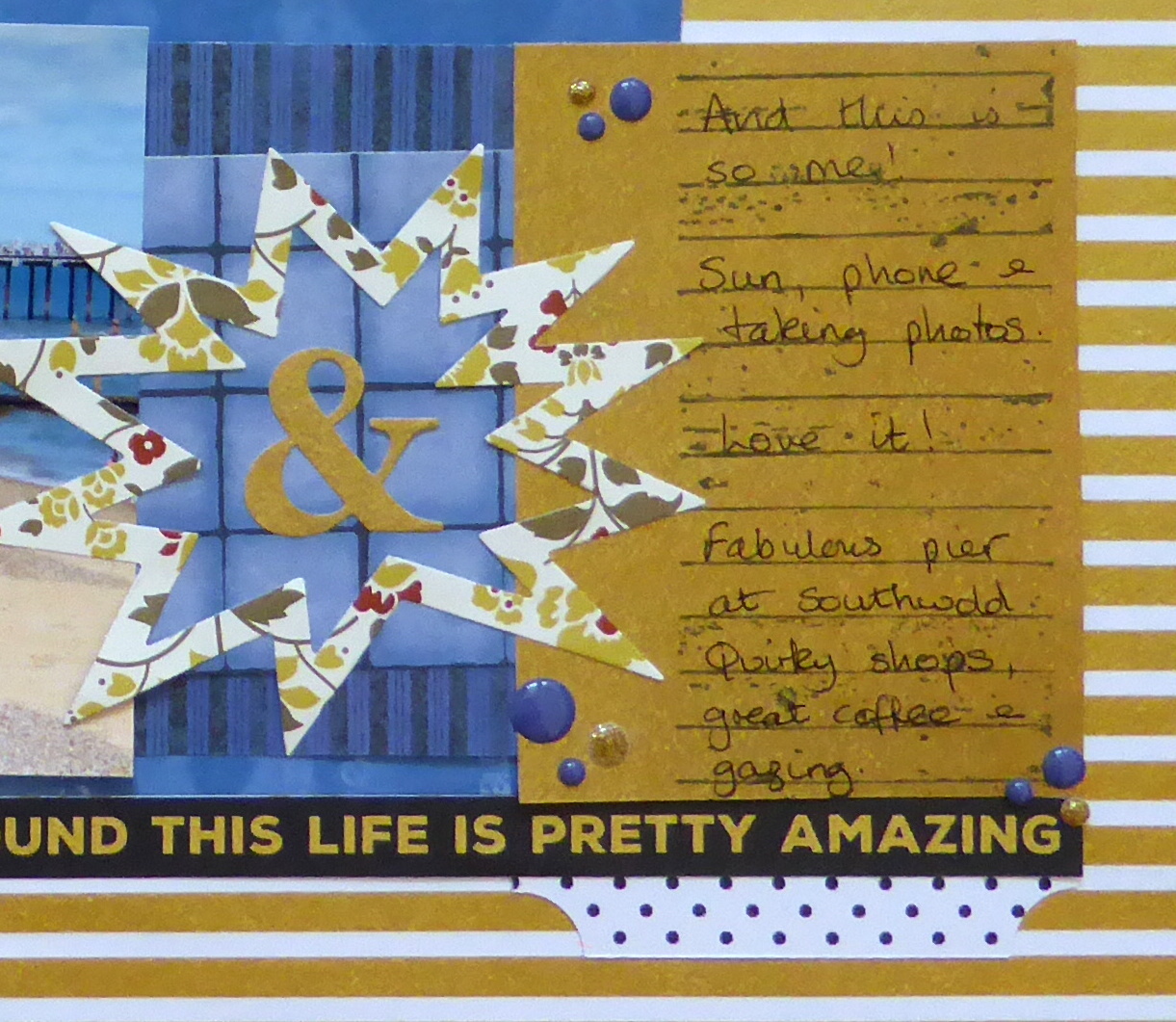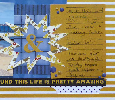 I love this photo of me in an iconic pose and knew it just had to be scrapped as soon as I saw it. I decided to use a theme from Shimelle's 20 Project for my colour choices - opposite sides of the colour wheel - which also picked up on the blues and sandy colours from the photo.