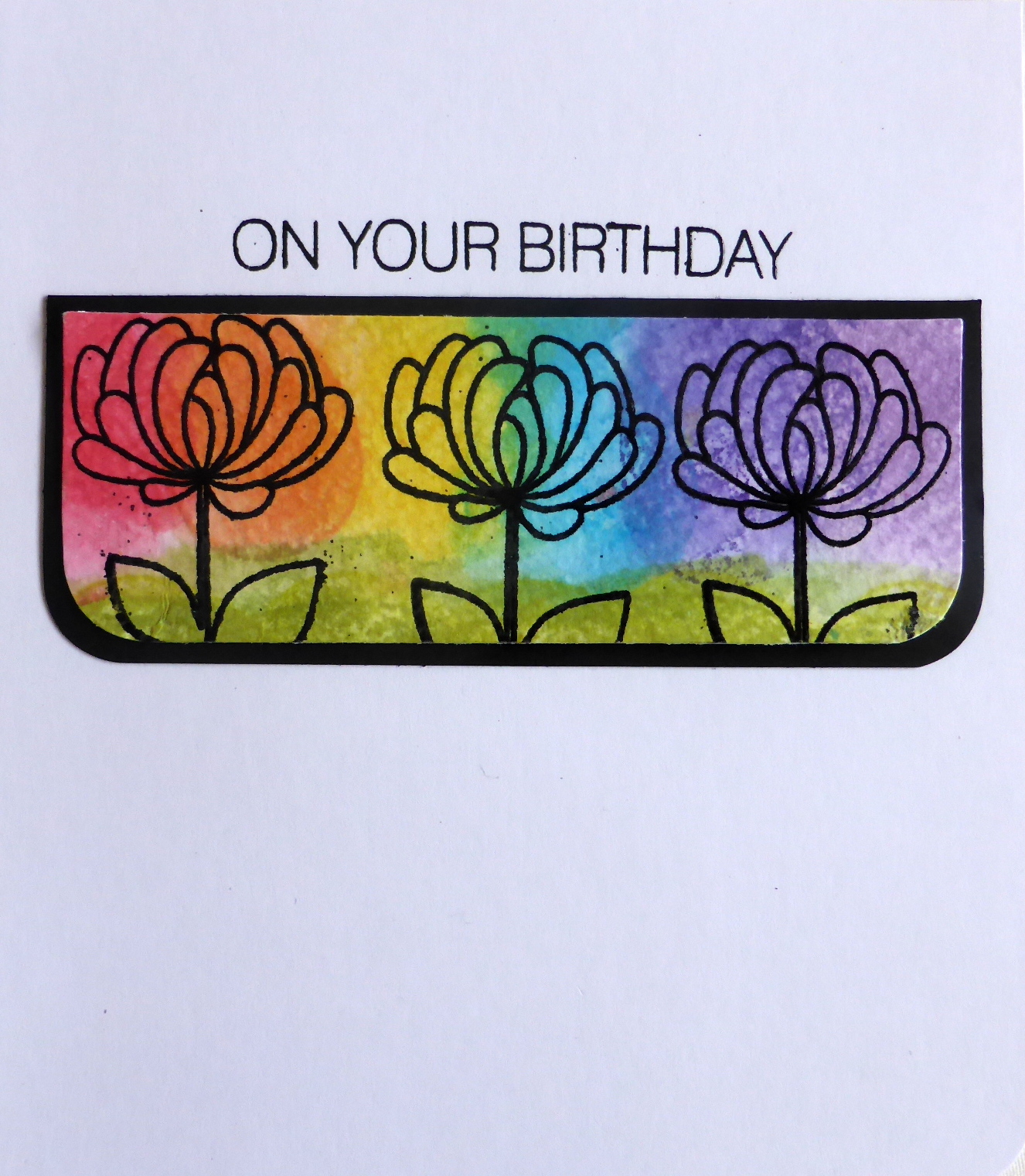I stamped and heat embossed a row of three iconic Uniko blooms onto watercolour cardstock. then I smooshed the rainbow of colours over the top, saving the green for the leaves and an impression of grass.