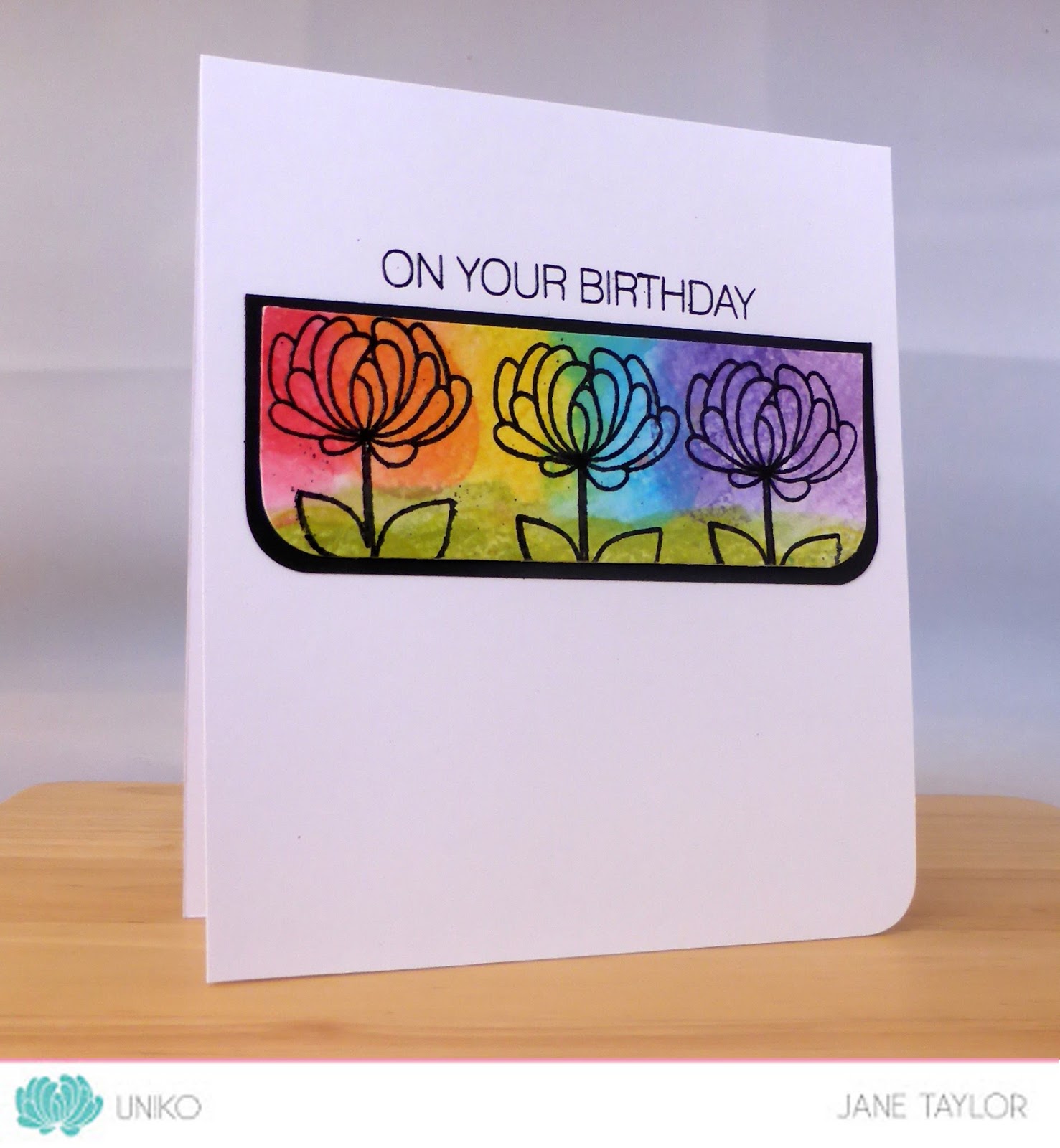 Ooozing rainbow to the max Jane, love your bold blending topped with the flower power blooms in trademark Uniko style. Perfect showcase and a fantastic card. Sarah x