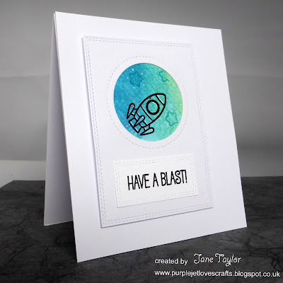 I created a watercolour background and then stamped and heat embossed the rocket. I added a trio of stars round the rocket and applied a liberal coat of sparkly Wink of Stella.