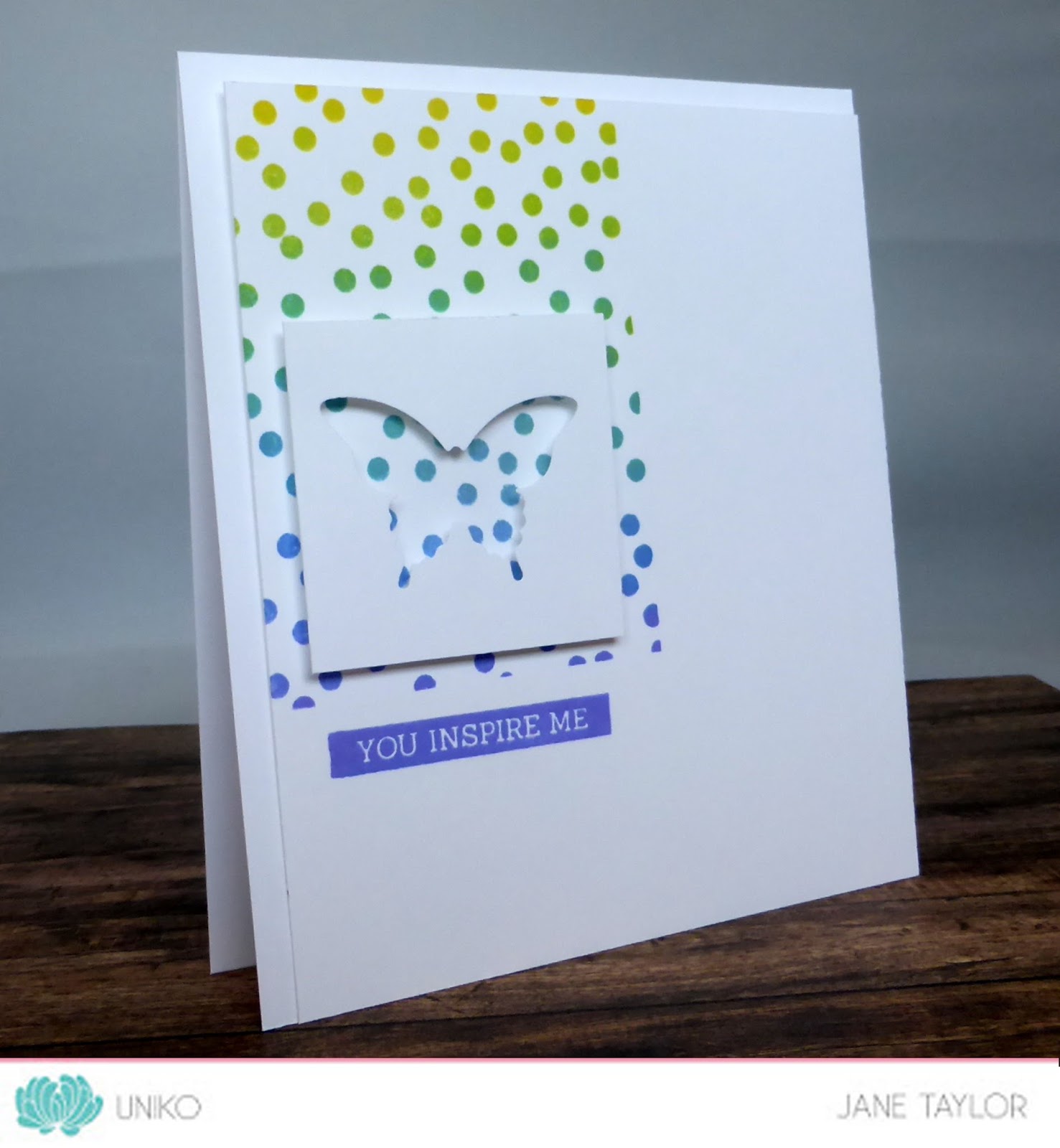 I cut a square from a leftover piece of card and punched a butterfly in the middle. This was raised on pads and I love how the polka dots peep through the aperture.