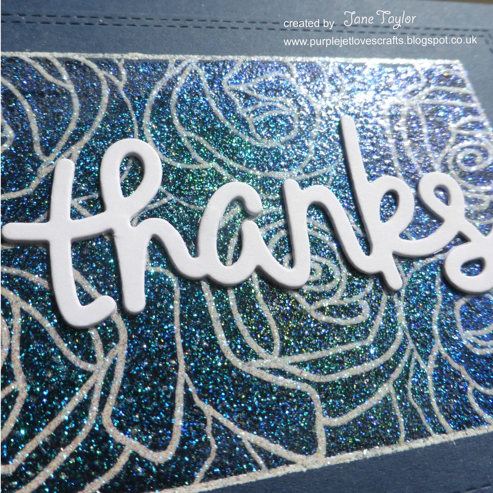 I die cut this panel into a stitched rectangle and then used a stack of three thanks diecuts on top. Check out all the sparkle in the photo below!
