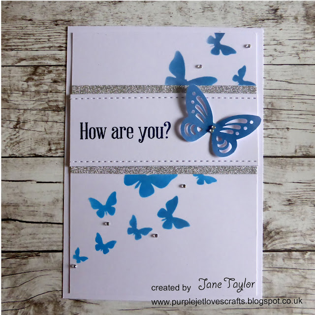 I used the Funky Fossil butterfly stencil and a couple of blue distress oxide inks to create the flow from corner to corner. I then stamped the greeting on a strip of card which I die cut to give it a stitched edge. This I matted onto sparkly silver card and adhered across the stencilled butterflies.