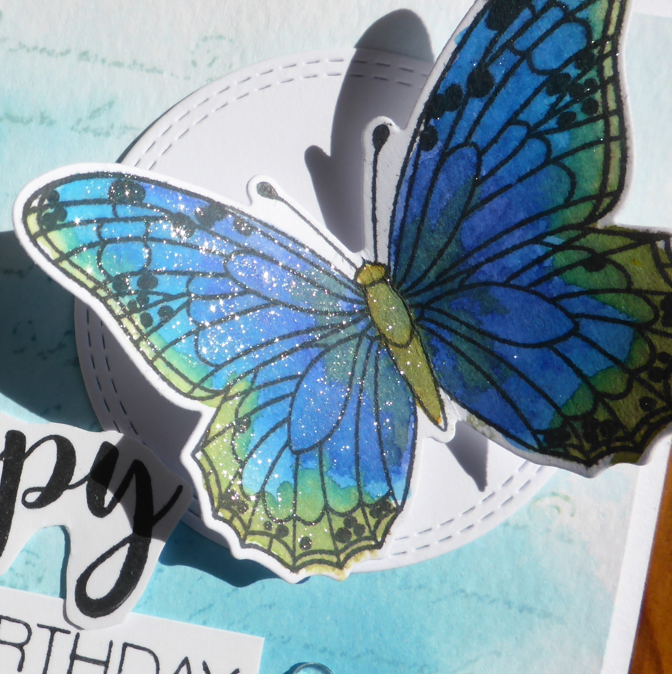 I popped her up onto foam pads and then added a trio of matching coloured ribbons to tie the two tags together.