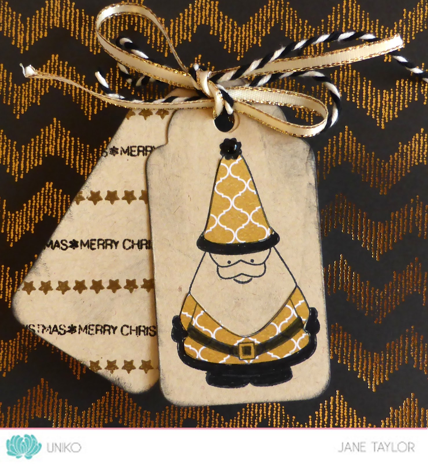 Apart from the fact that it has to be a tag - duh, you knew that! - the theme is anything goes. So I went to town and jazzed up a couple of tags in black and gold - my colours for Christmas 2015.