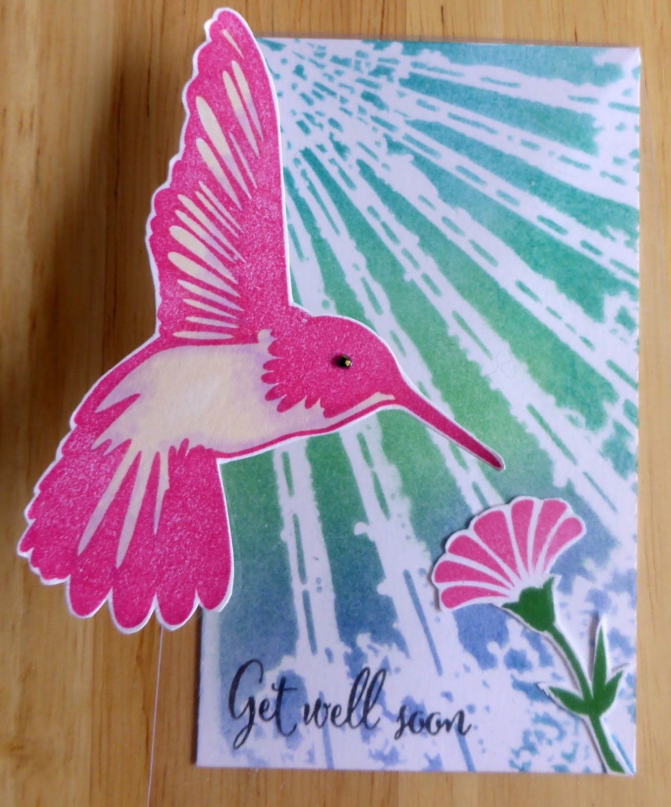 Once dry I stamped the hisbiscus flower repeatedly round the bottom corner using the masking technique to get depth. I then coloured just the pointy bit of the flowers - sure it must have a proper name! Finally I added the sentiments and some sequins.